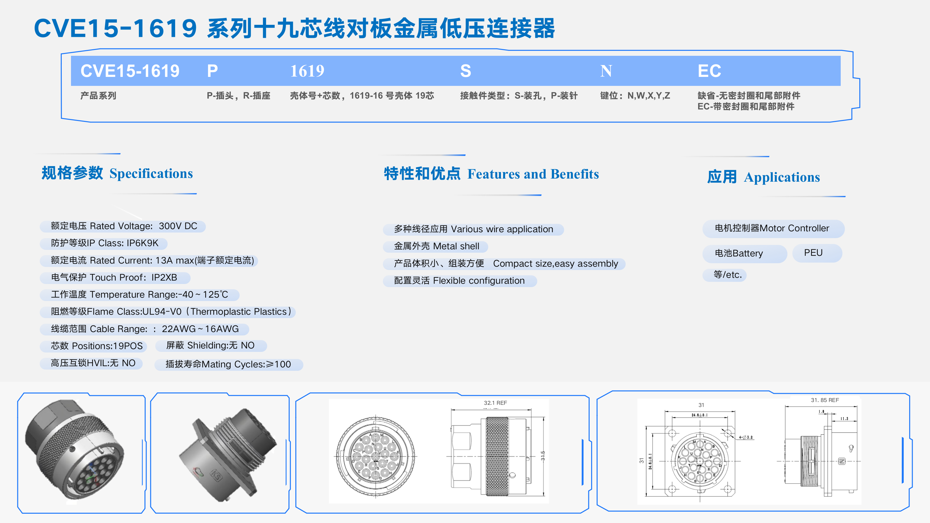 CVE15-1619 系列十九芯線(xiàn)對板金屬低壓連接器
