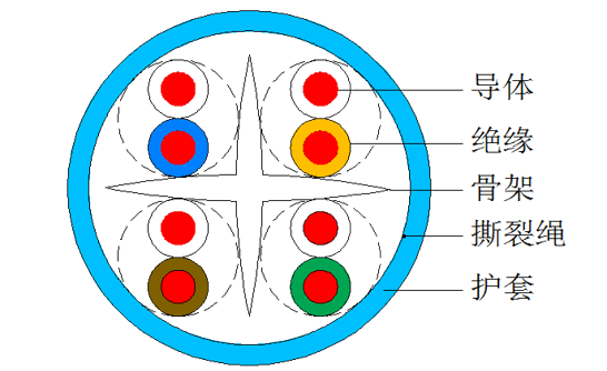 成纜:4對芯線(xiàn)對絞集合,十字骨架填充,橙/白橙、藍/白藍、綠/白綠、棕/白棕