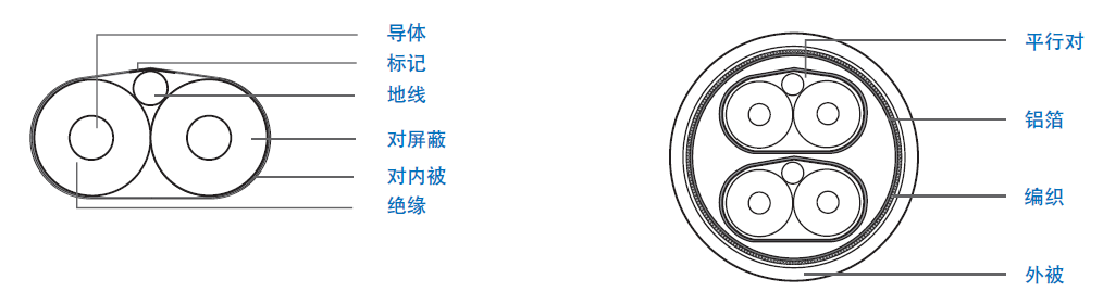 | 導體:28 AWG 單根鍍銀銅線(xiàn), 外徑0.35 mm | 半成品:2 對 (#1-2) 一起成纜 |