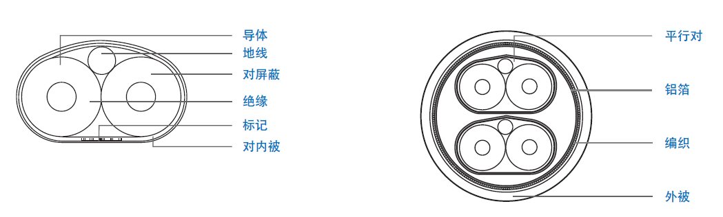 | 導體:24 AWG 單根鍍銀銅線(xiàn), 外徑0.508 mm | 半成品:2 對 (#1-2) 一起成纜 |